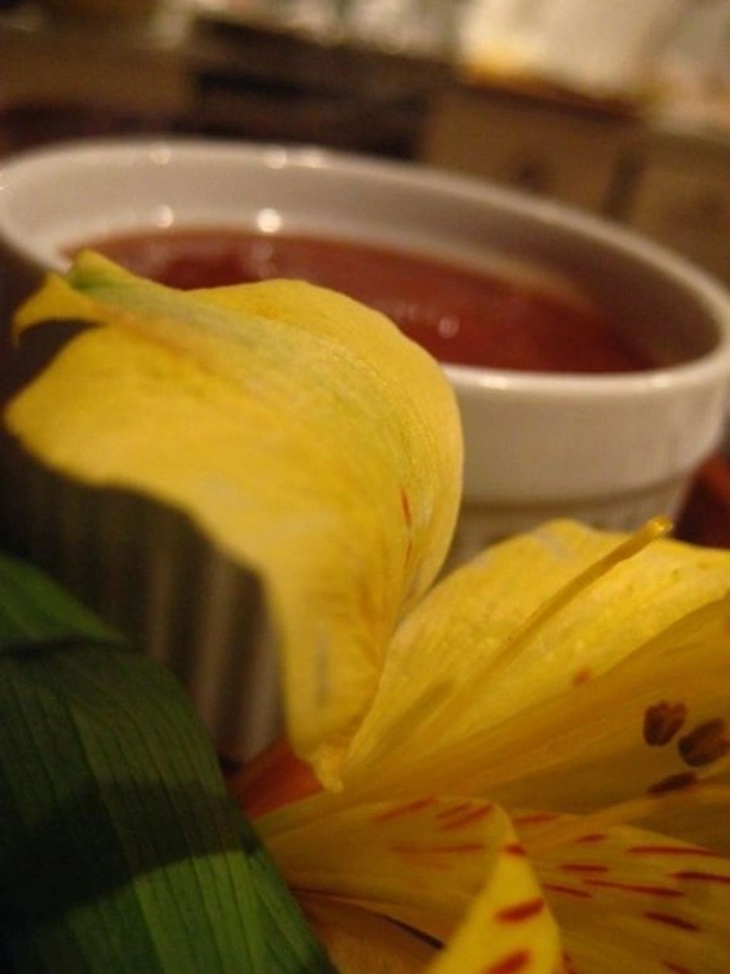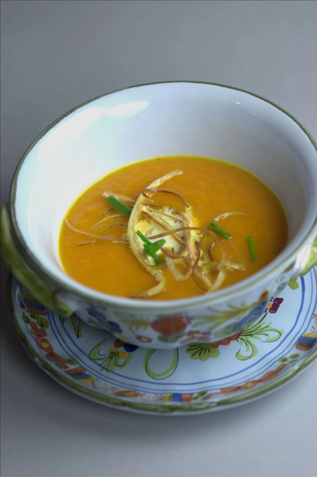 Moroccan carrot soup ~ garlic cream, frizzled leek